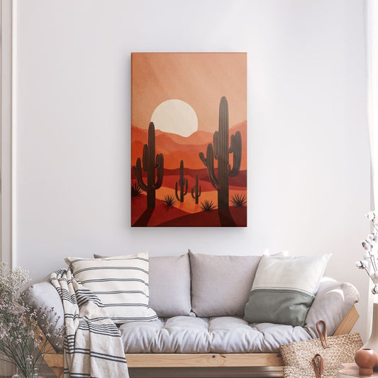 Si vous avez un intérieur au style bohème, associez vos tableaux à des matières naturelles comme le rotin, le bois clair et le lin. Pour une décoration moderne, des tableaux désert en noir et blanc ou minimalistes créent un contraste élégant et contemporain.