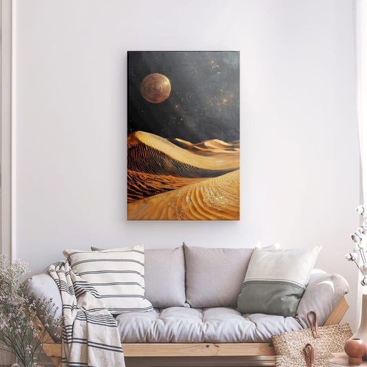 Pour un salon ou une grande pièce à vivre, un format panoramique représentant des dunes majestueuses ou un coucher de soleil apportera une atmosphère chaleureuse et immersive. Dans une chambre, préférez des teintes douces et apaisantes, comme le beige, le sable ou l’ocre, pour inviter au repos et à la détente.