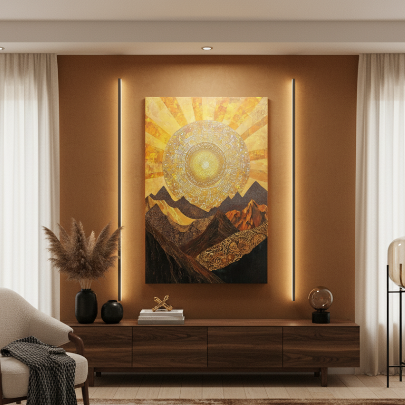 Associer votre tableau à des éléments naturels comme du bois, de la pierre ou des textiles doux renforce la sensation d’évasion et d’authenticité.