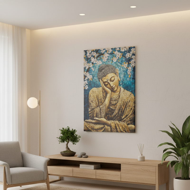 Un tableau représentant une fleur de lotus, une cascade, des pierres empilées ou Bouddha est idéal pour instaurer une ambiance zen. Le choix dépend de la pièce et de l’émotion que vous souhaitez transmettre.