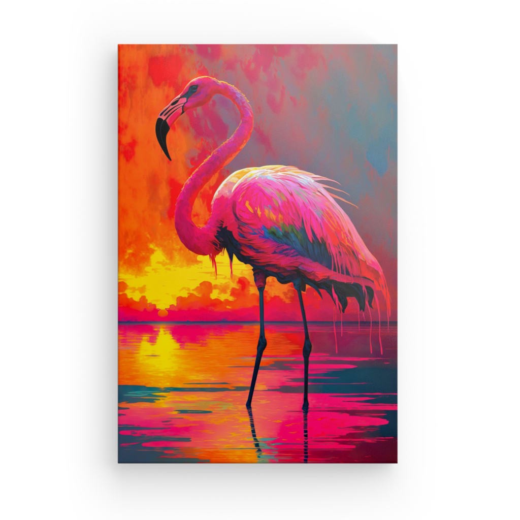 Laissez-vous emporter par le charme de la nature exotique avec ce tableau décoratif représentant un flamant rose minutieusement détaillé dans un environnement baigné de la chaude lumière d'un coucher de soleil. Les nuances de couleurs vives et éclatantes apportent une touche exotique et chaleureuse à votre décoration murale. Ce tableau est idéal pour les amoureux de la nature et les passionnés d'oiseaux tropicaux.