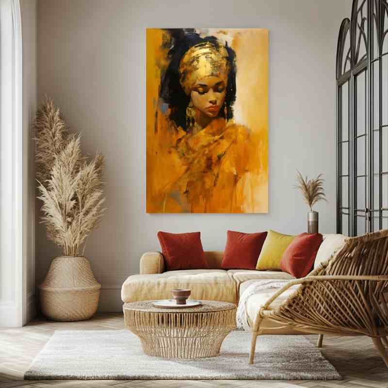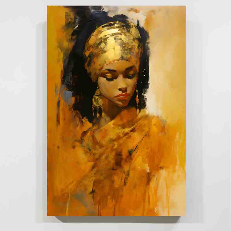 Le tableau "Oriental Doré" est une pièce d'art époustouflante qui incarne la splendeur de l'Orient. Au centre de cette composition se trouve une femme élégante qui regarde vers le bas, drapée dans un somptueux foulard doré. Elle est encadrée par un fond baigné de la richesse du jaune doré, créant ainsi une ambiance de luxe et de raffinement.