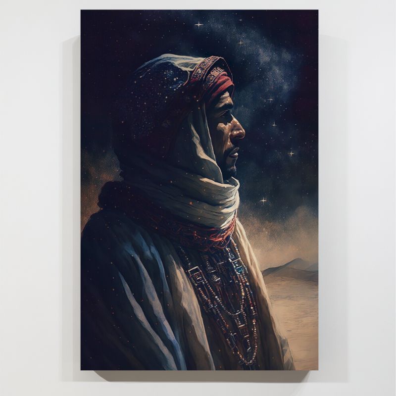 Ce tableau est une représentation époustouflante de la beauté et de la grandeur du désert, ainsi que de l'humilité de l'homme face à la nature. Les couleurs chatoyantes de la nuit, associées aux détails minutieux de la représentation du Touareg, créent une ambiance mystérieuse et envoûtante.